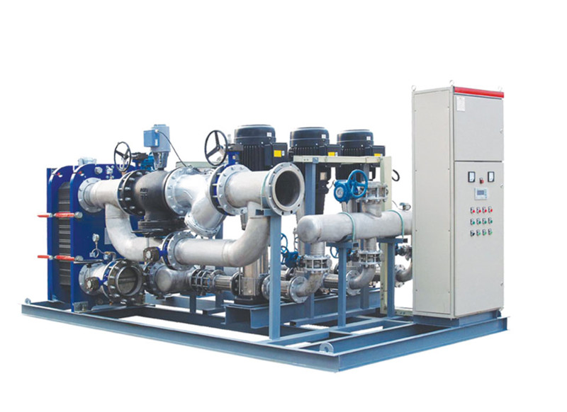 換熱機(jī)組的構(gòu)成及工作原理換熱機(jī)組是集成板式換熱器、循環(huán)泵、補(bǔ)水泵、電控柜、溫控裝置、各種傳感器、熱量計(jì)、溫度計(jì)、壓力表、管路和閥1門等于- -體,并組裝在公共底座上的熱交換成套組合裝置。一次側(cè)熱源(蒸汽、高溫水等),經(jīng)過除污器過濾后,進(jìn)入板式換熱器與二次側(cè)循環(huán)水進(jìn)行熱交換,然后返回一次側(cè)回水管網(wǎng)。二次側(cè)循環(huán)水經(jīng)過除污器過濾、循環(huán)泵加壓后,進(jìn)入板式換熱器與一次側(cè)熱源進(jìn)行熱交換,然后進(jìn)入二次側(cè)供水管...